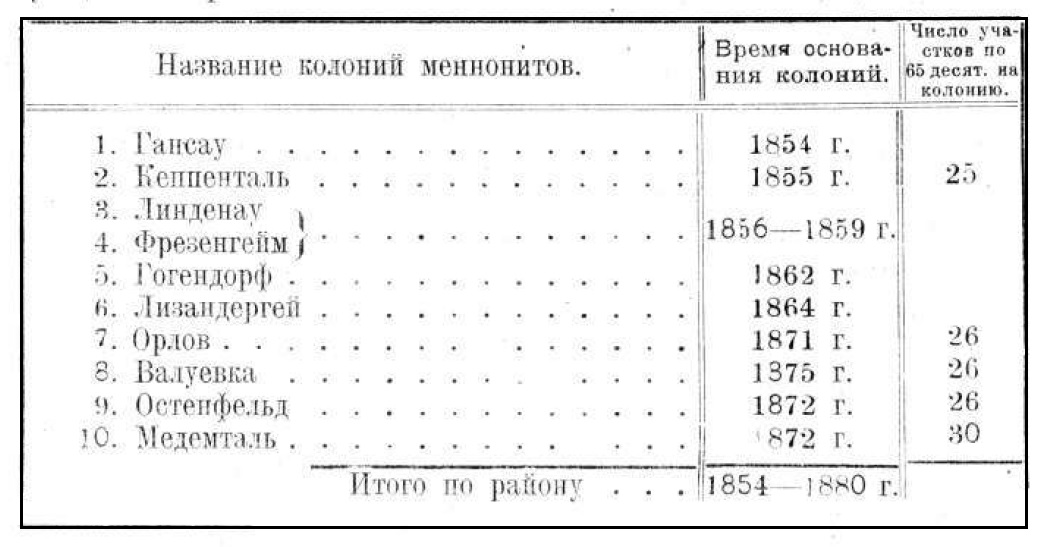В следующем 1855 году была основана здесь вторая меннонитская колония – Кёппенталь.13 А с 1856 по 1859 гг. появились колонии Линденау и Фрезенгейм, в 1862 – Гогендорф, а через два года приступили к основанию Лизандергея, заселённого в 1870 году. Через год после неё возникла колония Орлов и в пятилетие с 1875 по 1880 год были заселены и остальные участки, отведённые здешним меннонитам – образованы колонии – Остенфельд, Валуевка и Медемталь.14