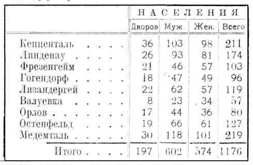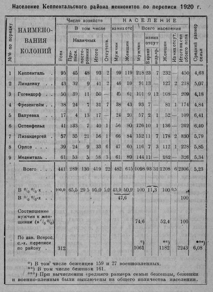 Более подробную картину распределения населения по отдельным колониям по Всероссийским сельскохозяйственным переписям 1920 и 1916 годов читатель найдёт в приводимой ниже таблице, а движение и состав населения за период с 1865 по 1922 год включительно – в приложении №2 к данной книге, в конце её.