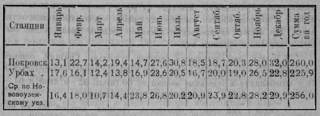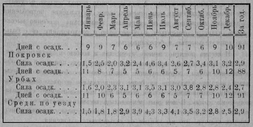 Немаловажное значение имеет в земледелии и самый характер выпадающих атмосферных осадков, их сила, а также количество дней в каждом месяце и году с ними. Приводимая ниже таблица даст читателю представление о их распределении и силе: