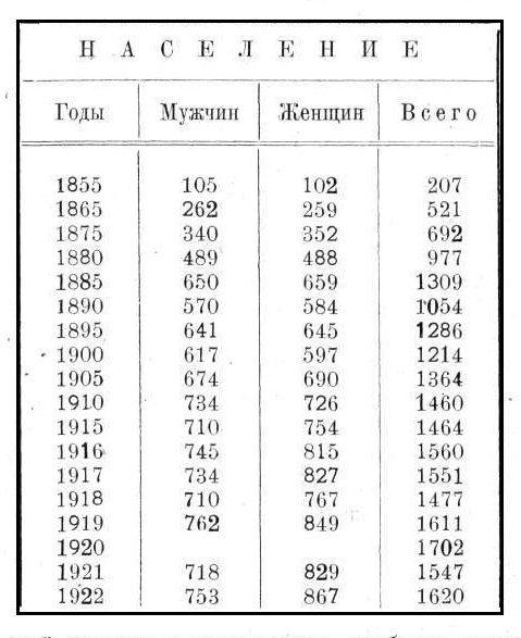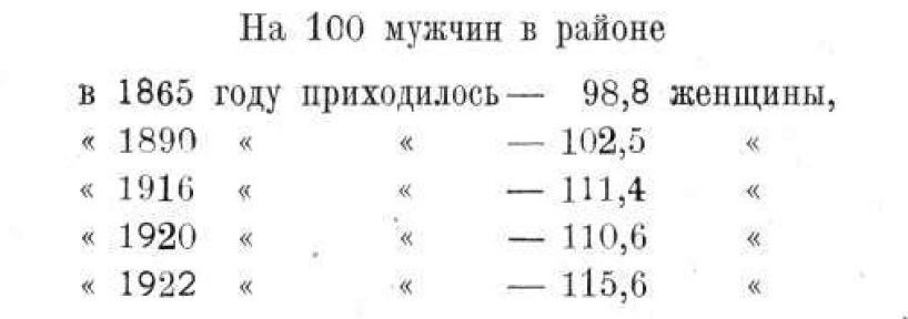 К 1895 году эта убыль населения почти совсем заравнивается, благодаря частичному возврату ушедших, окончанию колонизации и естественному приросту; затем в пятилетие 1900 – 1905 годов отсюда вновь выселилось несколько семей, что сказалось незначительным понижением кривой, после чего она, постепенно возрастая, начинает лишь падать в период войны и в 1918 году. Возвращение мобилизованных домой сильно влияет на поднятие количества населения, вновь уменьшившегося в 1921 году, благодаря, главным образом, голоду, выхватившему особенно стариков и детвору. Интересную картину рисуют кривые числа мужчин и женщин. До войны они почти покрывают одну другую или едва расходятся в сторону повышения количества женщин по сравнению с мужчинами; с начала же войны с каждым годом это расхождение всё увеличивается и уже ясно видно значительное превышение женщин.