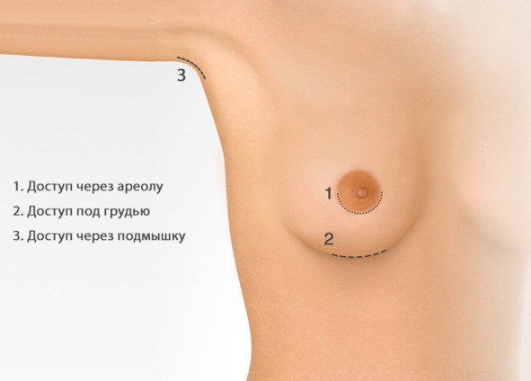 После того, как мы с вами определимся с формой и объемом имплантов, необходимо обсудить, в каком месте будет выполнен разрез. Всего существует 3 основных доступа для увеличения груди (Рис.3)