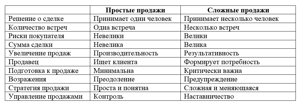 Основные отличия между простыми и сложными продажами показаны в следующей таблице.