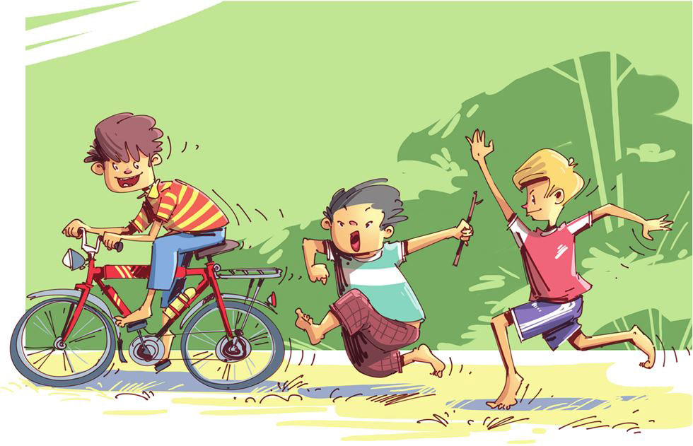 Миша поехал, а мы все побежали за ним следом. Миша жал на педали и звенел звонком. Велосипед пролетал ямы, переезжал камни и кочки нашего двора. Мы не отставали. Поэтому Миша всё время оглядывался, пытаясь оторваться от нас подальше. Но он ещё не умел вовремя переключать скорости и ехал не очень быстро. Бежавший следом Андрей пытался засунуть палку в колесо, чтобы остановить велосипед, догнать Мишу и сменить его. Наконец, мы настигли нашего друга и повалили его вместе с велосипедом на землю.