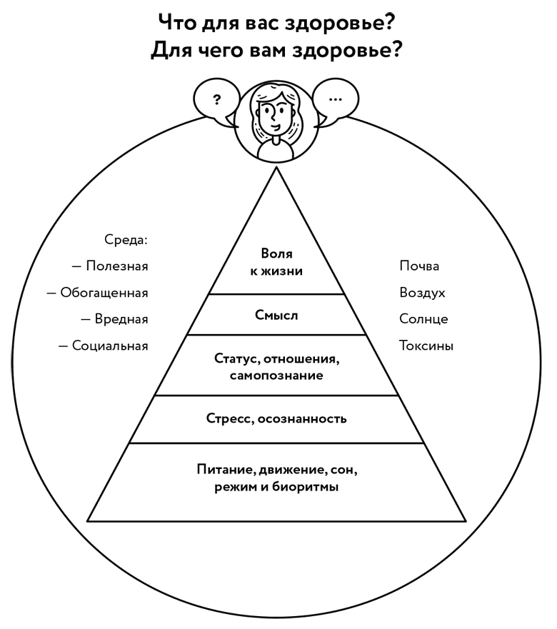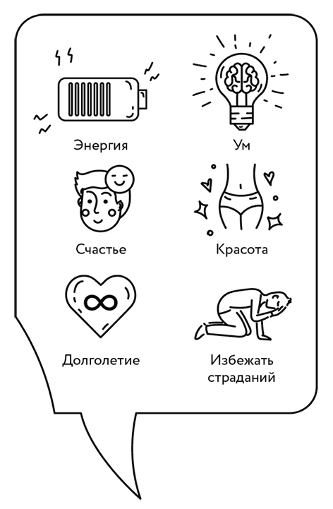 Дело в том, что здоровье – это инструмент и способ существования и достижения чего-либо, вторичная ценность, а не самоцель. Нам нужно здоровье для жизни, а не жизнь для здоровья. Равно как и другие вторичные ценности, такие как любовь, красивое тело, деньги, власть, моральные принципы, самовыражение, – они возникают в результате стремления к другим целям, спонтанно, во многом как побочный эффект. Когда человек ведет здоровый образ жизни и ему это нравится, он не прилагает никаких специальных усилий и в результате становится здоровым.