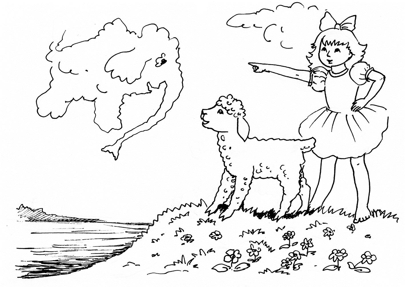 Вот плывёт облако, похожее на старинный комод Алёнкиной бабушки, а вот оно уже напоминает белку. А через мгновение – лодку с парусом, а ещё через минутку – волка. Барашек зажмуривается: он боится волка. Когда открывает глаза, облако, пролетев мимо, превращается в стог сена, и Барашкина мордашка расплывается в улыбке…