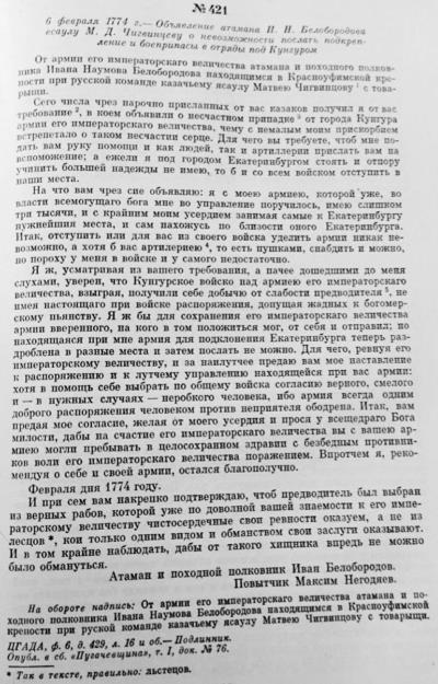 Издание показывает несколько автономных пугачёвских отрядов, которые друг друга никогда не видели, друг друга не знали, но действовали удивительно синхронно на расстоянии сотен вёрст! Причём в этих автономных войсках царил удивительный порядок власти – несмотря на некоторые беспорядки. Вот письмо Белобородова Чигвинцеву от Екатеринбурга, в котором Белобородов отказывает в помощи есаулу Чигвинцеву и требует снять плохого командира на Кунгурском плацдарме. На каком основании? Откуда?
