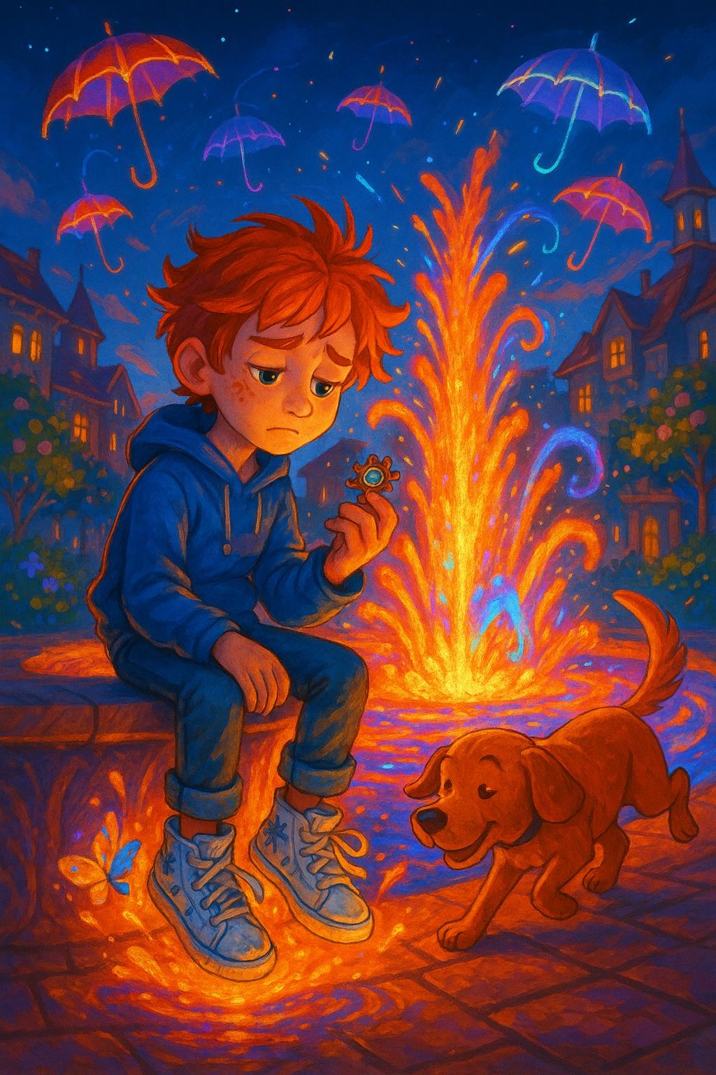 На краю этого волшебного кипения, свесив ноги так, что кончики его вручную разукрашенных маркерами «на удачу» кроссовок почти касались светящейся воды, сидел Джо-Джо Весельчак. Его огненно-рыжие волосы казались темнее в сумерках, а веснушки, словно рассыпанные чьей-то щедрой рукой золотые пылинки, почти сливались с кожей. В пальцах он вертел осколок циферблата – теплый, с чуть зазубренным краем. Последняя память о Тихоне. Будильник-друг, жертвуя собой, разлетелся на части, спасая своих друзей и саму Веселундию, теперь напоминал о себе лишь тихим звоном крошечной шестерёнки, которую Джо-Джо носил в кармане жилета, рядом с камнем в виде Чихающего Кота.