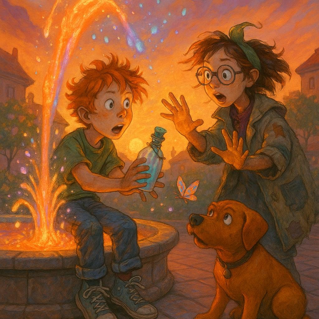 Рядом, растянувшись на теплой плитке из шоколадного мрамора, дремал Бублик – пёс-сыщик, чья шерсть цвета закатного апельсина сливалась с отблесками фонтана. Его большие, бархатные уши вздрагивали при каждом веселом всплеске, а нос, украшенный звездой-шрамом от давней встречи с колючкой кактуса-насмешника, подергивался, улавливая невидимые следы прошлого и будущего. Внезапно пёс громко чихнул – «Апчхи-бум!» – и из его ноздри вырвалась крошечная конфетти-бабочка, сверкнув радужными крылышками. Она, порхая как запятая в воздушном предложении, спикировала прямо в светящийся поток фонтана. Вода тут же вздыбилась, закружилась воронкой и с мягким булькающим звуком, похожим на удивленный вздох, вытолкнула на поверхность стеклянную бутылку странного вида. Она была темно-зеленой, как бутылочное стекло склянок из старых аптек, а бирюзовая пробка была туго обмотана колючей, ржавой проволокой, от которой веяло запахом старого железа и заброшенных чердаков.