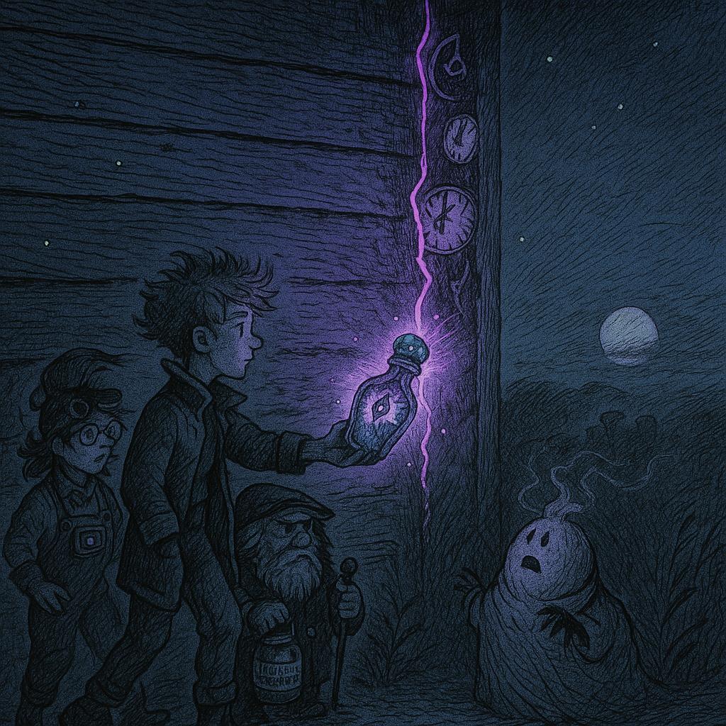 На рассвете, когда луна еще цеплялась серебряным когтем за край горизонта, а воздух звенел от последних предрассветных грез, друзья стояли перед пульсирующим Разломом. Ворчун, выглядевший мрачнее обычного, опирался на посох, к которому была привязана банка его знаменитого варенья из «Вечноцветущей Ромашки» с этикеткой «На Самый Крайний Случай!». Гизмо, похожая на готового к бою маленького инженера, последний раз проверяла настройки «Смехометра 2.0», бормоча про «частоту ностальгических вибраций». Пусик, обмотанный теперь тремя шарфами разной степени прозрачности, дрожал так, что его контуры расплывались, как тень на ветру.