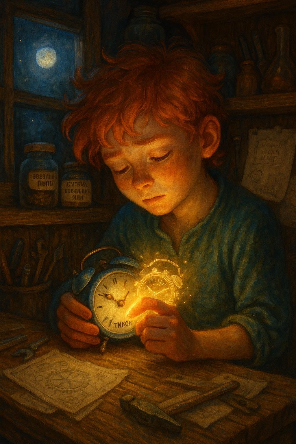 Остаток ночи они провели не в своих постелях, а в уютной мастерской папы Джо-Джо. Запах сосновой стружки, масла и чего-то вечно паяемого витал в воздухе. На высокой полке, между банками со «Звёздной Пылью для Чистки Механизмов» и ящиком с надписью «Смех Экстренной Помощи (Только для Чёрных Дней!)», стоял Тихон. Целый. Безупречный. Его латунный корпус блестел в свете масляной лампы. Но это была лишь точная копия, созданная умелыми руками папы. Красивая, но… молчаливая и пустая. Джо-Джо подошел, поднялся на цыпочки и прижал теплый осколок циферблата к холодному металлу копии, шепча так тихо, что слышал только он да, возможно, дремавший на верстаке кот: