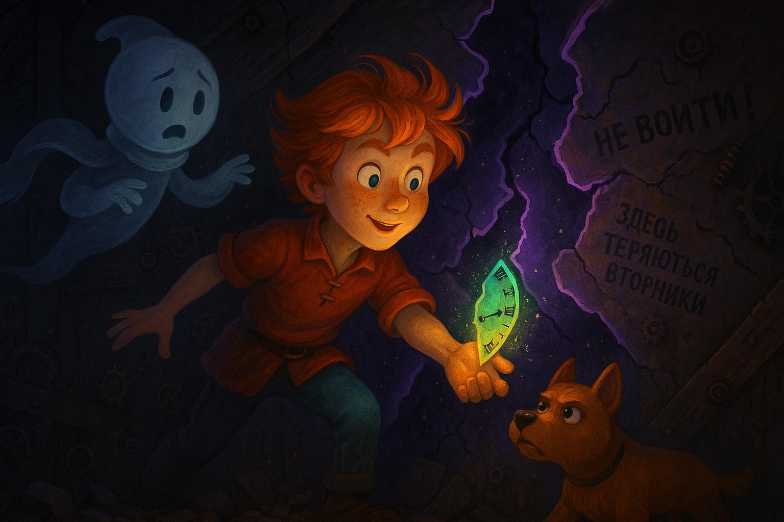 – С-смотрите! – прошептал призрак, и его голос задрожал эхом. – Он в-ведет прямиком в «Послезавтра»! Это ж… это ж вообще возможно? Я не хочу туда! Там может быть… что угодно!