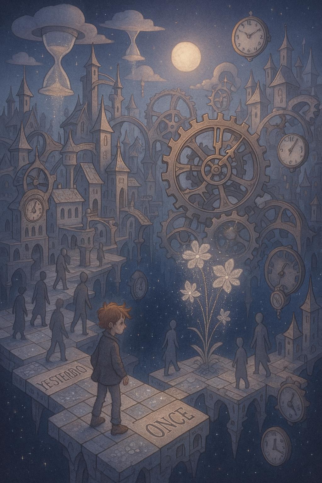 Город висел над бездной времен, как грандиозный, но хрупкий мыльный пузырь, запущенный капризным ветром Вечности. Не разбитый хрустальный шар, а скорее, застывшая на миг слеза самой Реальности. Стены города были сложены из плиток, на которых мерцали названия – не просто «Вчера», «Когда-то», «Скоро», а более личные: «Первый Шаг», «Несказанное Слово», «День, Когда Не Пришли», «Обещанное Завтра» – переливались под светом бледного, далекого солнца. Оно не грело, а лишь подсвечивало мир холодным, мертвенным сиянием старого фонаря в заброшенном подвале. Воздух гудел низким, непрерывным гулом – гулом самого Времени, текущего под ногами. И ветерок… Он был повсюду, этот ветерок. Он пах лавандой, высохшей между страниц старого дневника, пылью библиотек, где книги плачут чернильными слезами, и едкой горечью невыплаканных детских слез. Он трепал огненно-рыжие волосы Джо-Джо, запутывая в ней серебристые песчинки – застывшие, потерянные секунды.