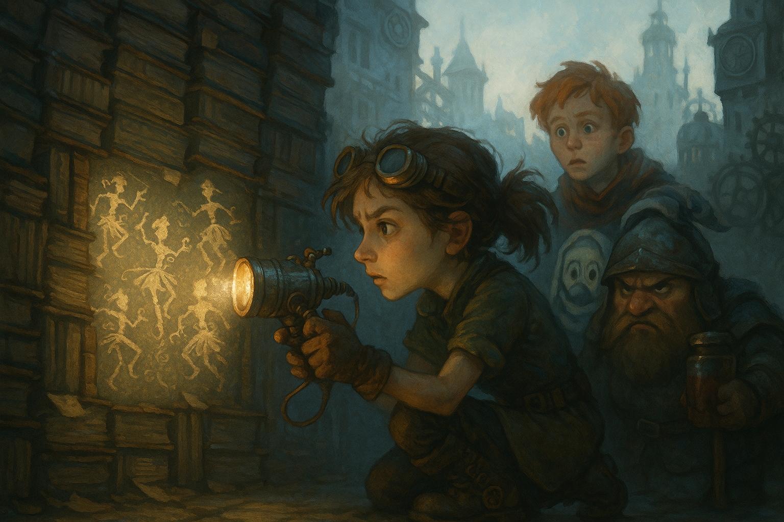 – Ребята, идите сюда! Смотрите! – позвала она, направляя луч на стену башни из пружин. Под странным светом проступили не просто силуэты – ожили крошечные, детализированные фигурки часовщиков! Они были запечатлены в вечном, изнурительном танце: одни натягивали пружины до предела, другие вплетали в механизмы тончайшие золотые и серебряные нити, третьи прислушивались к тиканью крошечных циферблатов ухом. – Они не просто строили… Они вплетали эмоции в механизмы! Смотрите на узлы – это же застывшие всплески радости! А эти изгибы пружин… они повторяют линии печали! Тут каждая деталь… она не просто функциональна, она… живая!