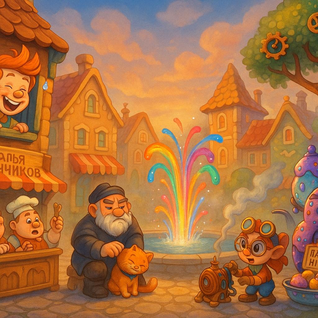 Гном, как всегда, сидел у Фонтана Сюрпризов, ворча на котёнка Лирика. Тот, пушистый комок с глазами-изумрудами, прыгал за радужными брызгами, которые обычно танцевали под утреннюю арию фонтана.