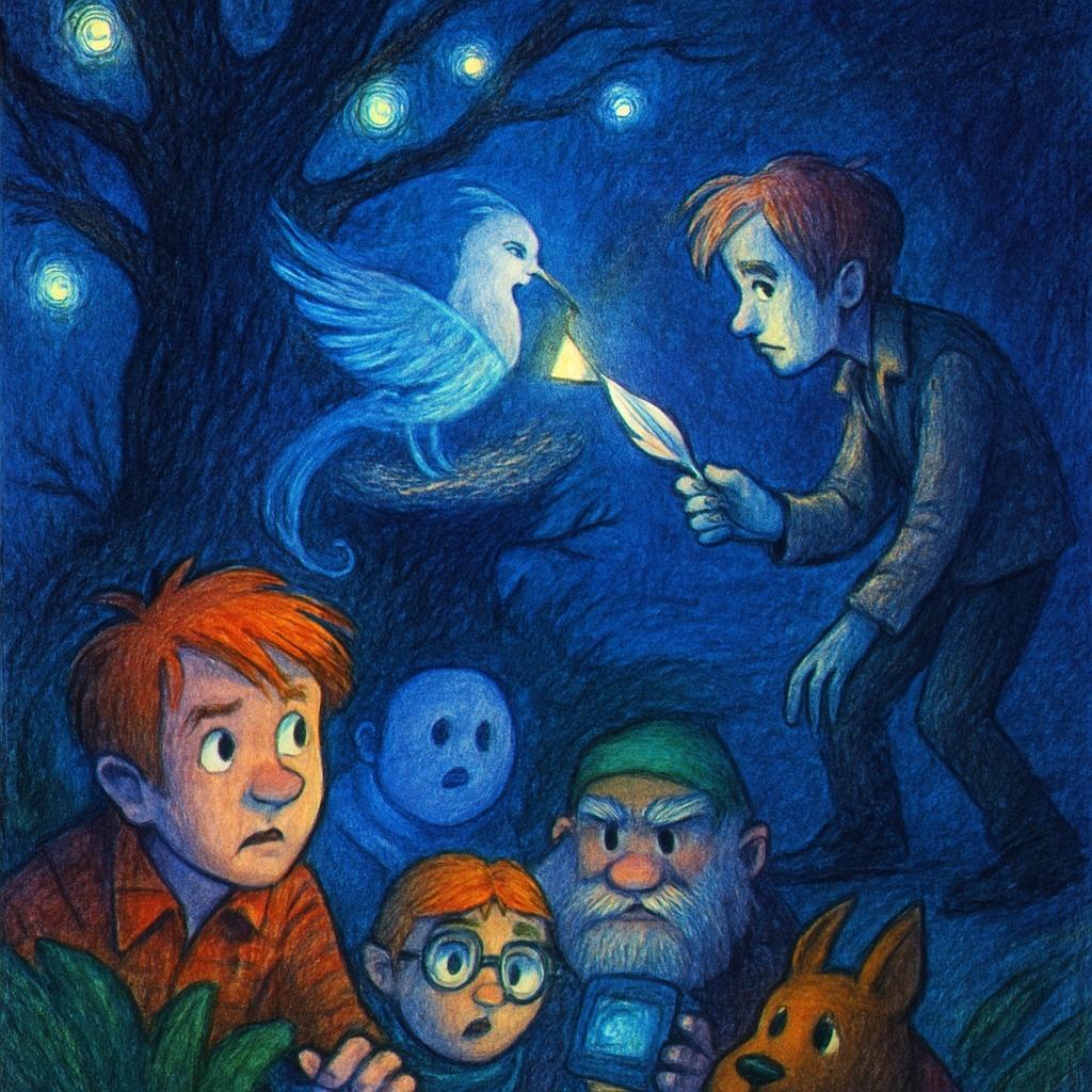 Джо-Джо вел их, следуя за слабым импульсом пера. Оно вывело их к небольшой поляне. В центре ее росло самое странное дерево во всем саду. Его ствол был черным, как-будто обугленным, а ветви были усыпаны не листьями, а тысячами крошечных, мерцающих фонариков-бутонов, похожих на захваченные в плен звезды. И на самой нижней ветви, в гнезде из переплетенных серебристых волокон, сидела птица. Не просто птица. Существо из света и тени. Ее оперение переливалось всеми цветами лунной дорожки, а длинный хвост струился, как жидкий жемчуг. Глаза были закрыты, но казалось, что она не спит, а лишь дремлет, храня какую-то великую тайну. И в клюве у нее, аккуратно зажатый, лежал мерцающий треугольный фрагмент – точь-в-точь как тот, что нашли в библиотеке! Часть Карты Несуществующих Мест!