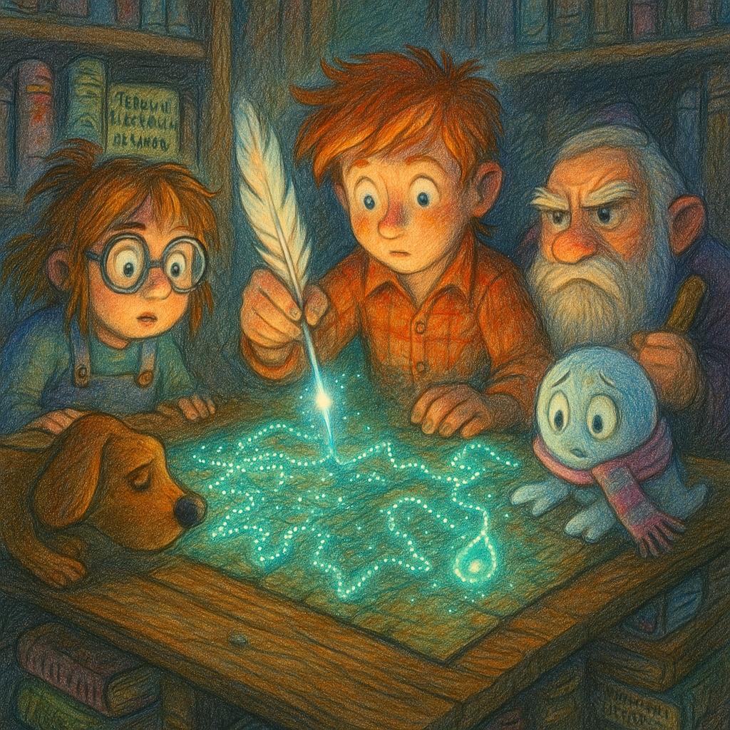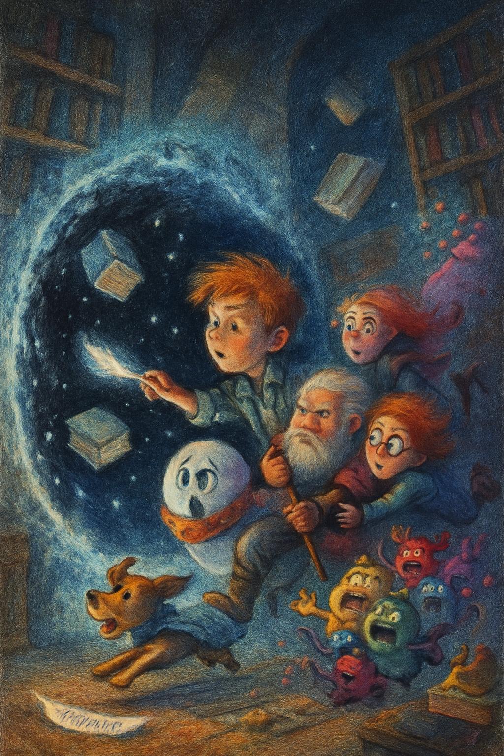 Он не раздумывал ни секунды. Сжав свое холодное перо так, что пальцы онемели, он шагнул в чернильную гладь портала. Ощущение было странным – не падение, а погружение в ледяную, тягучую темноту, пронизанную светом далеких книжных солнц. За ним, вцепившись мертвой хваткой в его куртку, прыгнул Пусик с тихим: «Ой, я не хочууу…». Ворчун, ругаясь на чем свет стоит и хватая Гизмо за руку («Держись, изобретательница, а то затеряешься в каталогах вечности!»), прыгнул следом. Бублик, не раздумывая, с громким: «Стой, подозреваемый! Сыщик Бублик идет!», бросился в чернильную бездну.