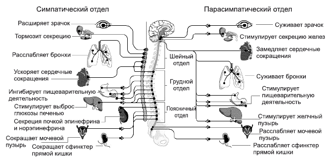 Как мы видим, работа симпатического отдела мобилизует организм, а парасимпатического – возвращает его к покою и способствует накоплению энергии