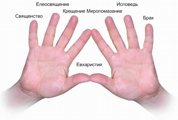 Священник Михаил Залесский предложил иллюстрировать семь таинств на пальцах двух рук. Это можно сделать таким образом2: