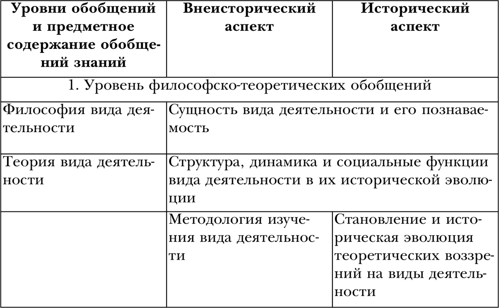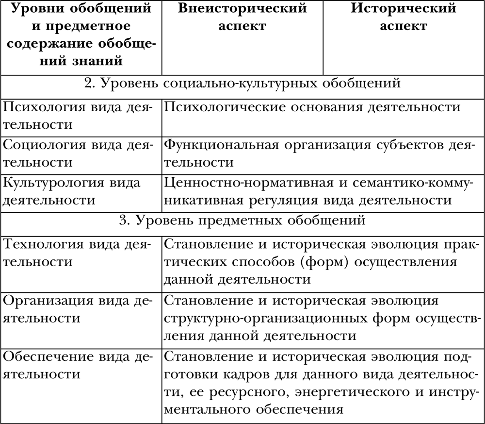 В принципе речь идет о том, что в любой области познания видов и форм человеческой жизнедеятельности помимо уровня философских обобщений, касающегося вопросов сущности и базовых закономерностей, определяющих тот или иной вид деятельности и ее результаты (продукты), и уровня предметных обобщений, связанного с вопросами непосредственных технологий, организации и обеспечения деятельности, можно выделить и специфический уровень социокультурных обобщений. Последний исследует историю данного вида деятельности (ее генетический аспект), психологию (мотивационный аспект), социологию (организационно-функциональный аспект) и культуру данного вида деятельности (ценностно-нормативный и семантико-коммуникативный аспекты). Эти четыре ракурса исследований и обобщений лишь опосредованно связаны с предметом самой деятельности, но акцентированы на проблеме субъекта этой деятельности, ее исполнителя, на мотивации, организации и экстраутилитарной регуляции его участия в процессе (см. табл. 2).