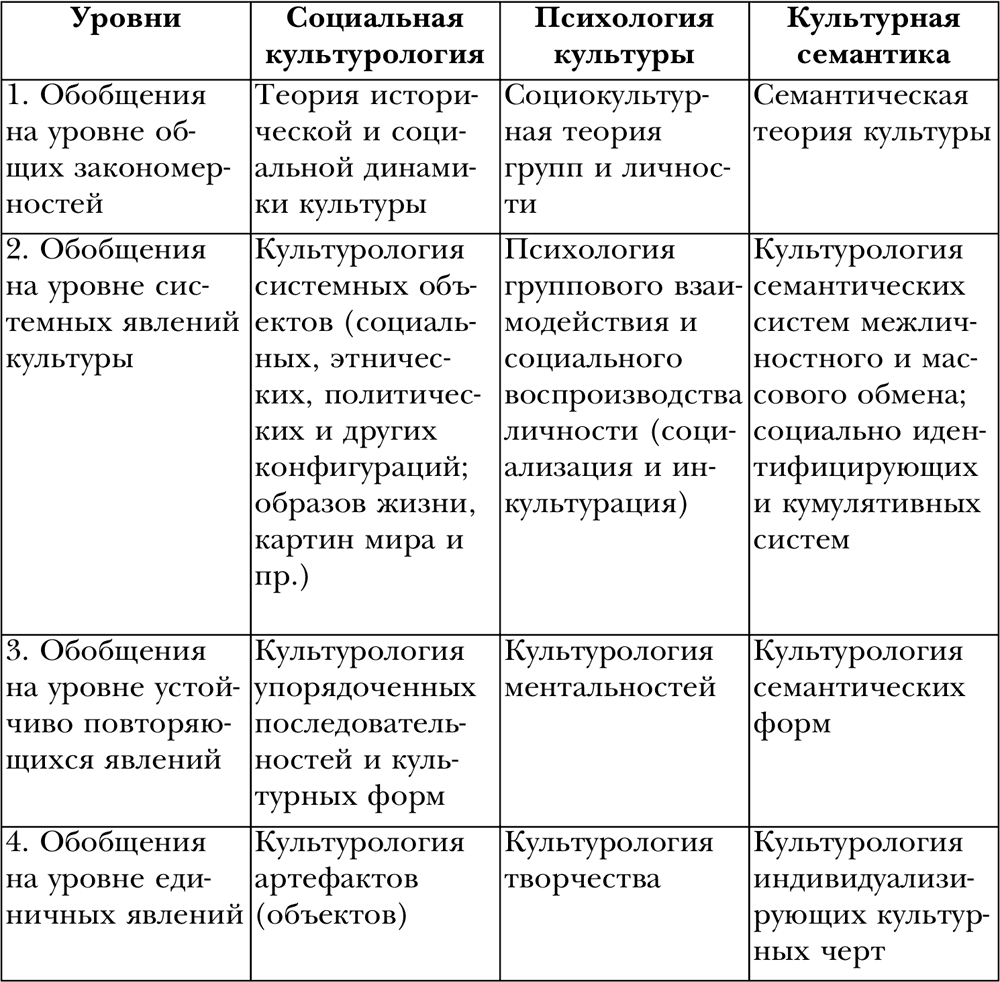 Вышеперечисленные направления фундаментальной культурологии могут быть иерархизированы по следующим четырем уровням выделения исследовательских объектов и научного обобщения полученных результатов: