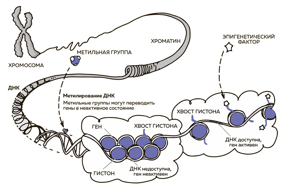 Основные пути регуляции активности генов – модификация гистонов и метилирование. Гистоны – особые белки, на которые, как на катушку, намотана ДНК в ядре клетки, что образует плотную упаковку – нуклеосому. Чем плотнее эта упаковка, тем меньше ДНК доступна для ферментов, ведущих транскрипцию – синтез РНК по матрице ДНК. А поскольку меньше РНК, постольку меньше производится белка. Это значит, что ген в этой области будет мало или вовсе не активен. Однако сигналы, получаемые из внешней для клетки среды, могут способствовать более свободному расположению этих «катушек», благодаря чему ферменты получают доступ к этому участку ДНК. Это значит, что РНК, а затем и белки могут быть синтезированы – ген активен.