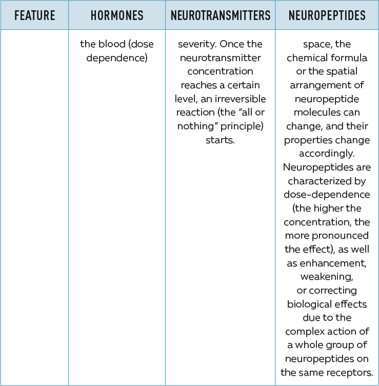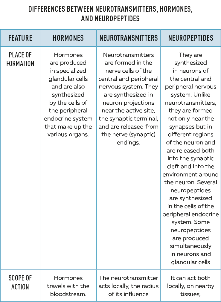 The difference between hormones and neurotransmitters with the same chemical formula can be seen in noradrenaline. The hormone noradrenaline is produced in the adrenal glands during stress. Its effect is similar to adrenaline, but it has a more pronounced vasoconstrictive effect and has less effect on the heart rate, a less significant effect on the smooth muscles of the intestines, etc. That is, the sphere of influence of the hormone noradrenaline is internal organs. It is controlling the body's response to stress.