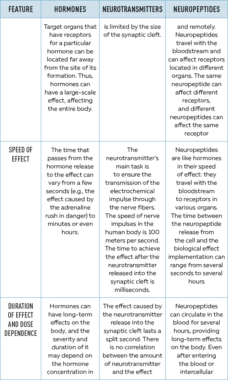 The main difference is that hormones are produced only in the endocrine glands, while neurotransmitters are produced exclusively by neurons. Therefore, the effect of neurotransmitters is limited to the nervous system, and hormones act on the periphery and cannot penetrate the brain they are hindered by the blood-brain barrier.
