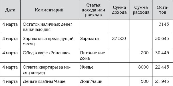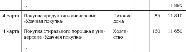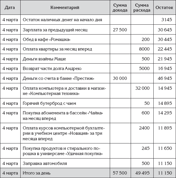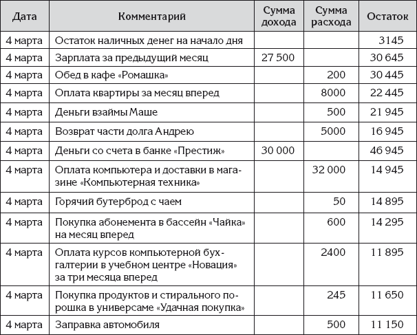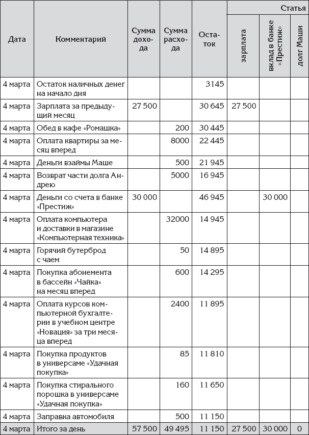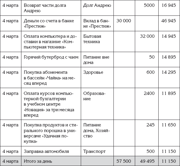 Затем Ирина занесла в эту таблицу денежные операции за прошедший день. Новый вариант Ирининых записей показан в табл. 5.