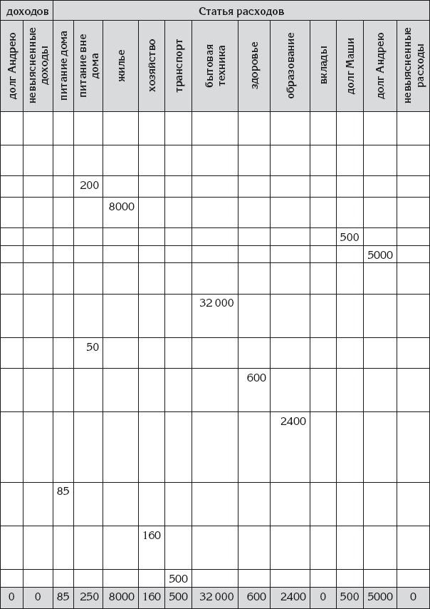 И Ирина решила еще раз усовершенствовать свои записи. Она открыла свою тетрадь на чистом развороте и начертила на всю ширину (то есть на две страницы) новую таблицу, состоящую из двух частей. Левая часть повторила прежнюю Иринину таблицу для записи денежных операций. А в правой части для каждой статьи доходов и расходов Ирина начертила собственный столбец.
