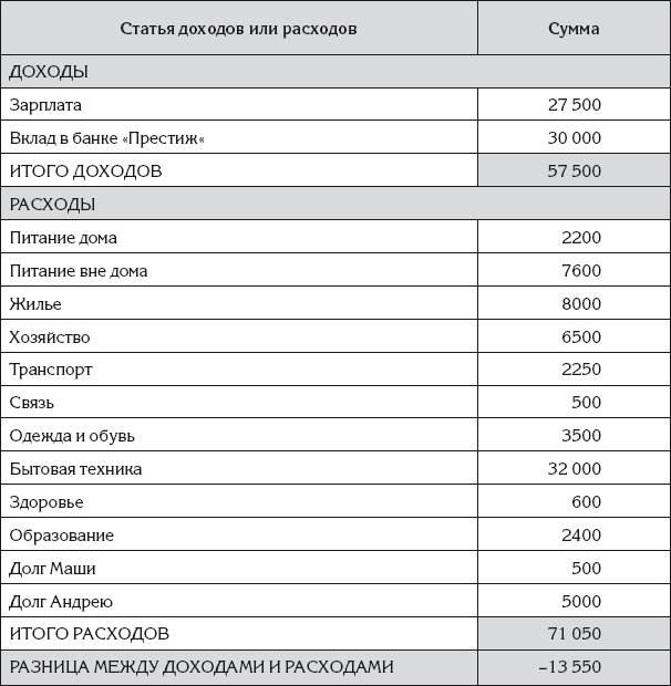 С доходами и расходами как таковыми Ирина разобралась. Осталось решить, что делать с теми доходами и расходами, которые, как она поняла, таковыми не являются, то есть с теми, которые в Иринином бухгалтерском учете личного хозяйства первоначально были отнесены к статьям Долг Маши, Долг Андрею и Вклад в банке «Престиж».