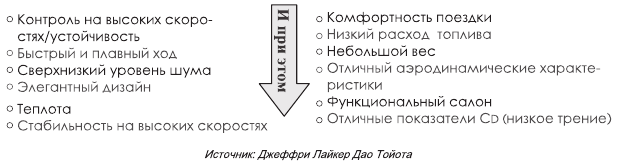 Такая постановка задач характерна и для проектирования портативной техники. Вот очень показательный пример (Рис. 2), взятый из книги «Дао Toyota» Джеффри Лайкера. Ичиро Судзуки был назначен главным инженером для разработки «Лексуса». Его подход к стимулированию альтернативного мышления у команды разработчиков заключался в требовании совмещать прежде несочетаемые характеристики автомобиля. Например, раньше снижение уровня шума достигалось путём увеличения массы, которая поглощала вибрации. К «Лексусу» же было предъявлено требование: он должен быть «сверхтихим» и при этом «иметь небольшой вес». Таким образом, Судзуки заставил инженеров