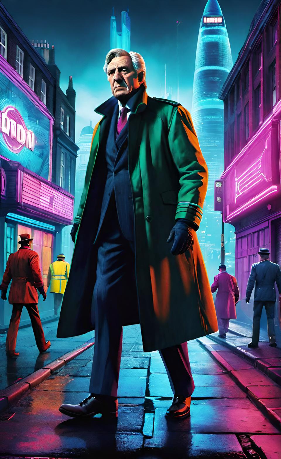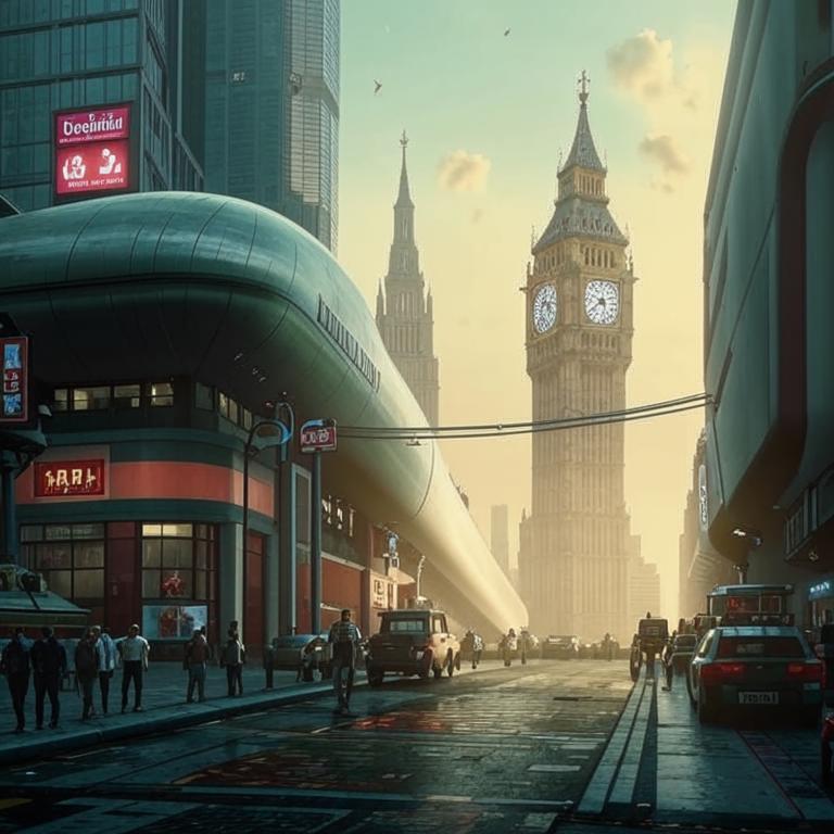 Лондон 2084 года предстается в иной, чем мы привыкли, перспективе: его улицы окутаны дымкой ретро-фантазий и неонового блеска, словно город оказался запечатлённым на пленке старых научно-фантастических фильмов 1950-х. По небу величественно парят гигантские министерства, возведённые в стиле ар-деко. Каждое здание выглядит как монумент в честь ушедшей эпохи оптимизма – массивные структуры с вращающимися пропеллерными шпилями, будто созданные для завоевания пространства и времени. Эти небоскрёбы, с их гладкими линиями и сверкающими хромированными элементами, вызывают ощущение, что само небо – стало ареной для танца машин и пара, где прошлое и будущее сливаются в единое целое.