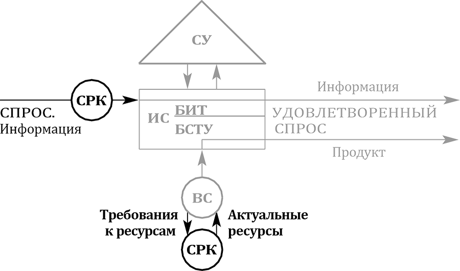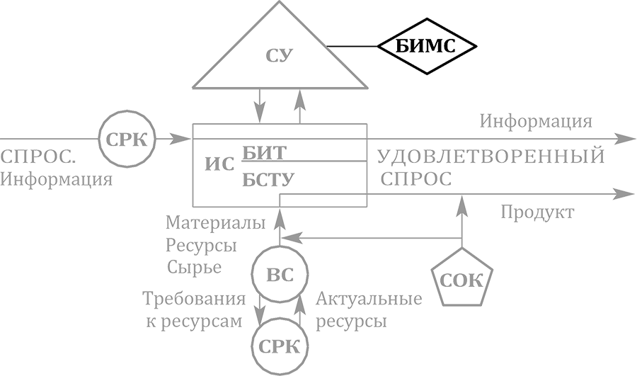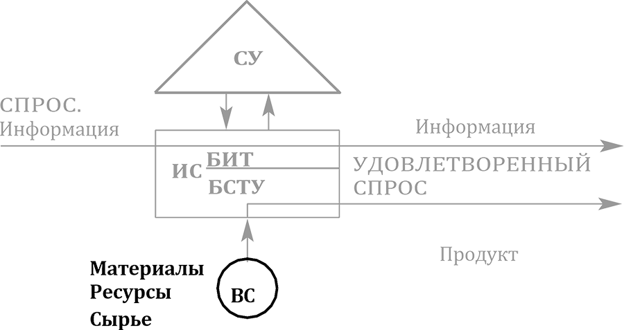 ИС – исполнительная система; СУ – система управления; БИТ ИС – блок исполнения требований исполнительной системы; БСТУ ИС – блок создания товара или услуги исполнительной системы; ВС – вспомогательная система