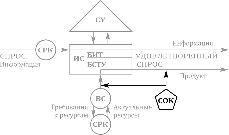 СУ – система управления; СРК – система реализации коммуникатирования; БИТ ИС – блок исполнения требования исполнительной системы; БСТУ ИС – блок создания товара или услуги исполнительной системы; ВС – вспомогательная система; СОК – система обеспечения качества