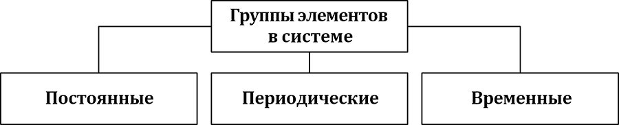 Устойчивые группы элементов, обеспечивающие реализацию устойчиво существующих процессов системы, как правило, относящиеся к тем группам, которые существуют постоянно, пока существует процесс, реализуемый системой, относятся к постоянным группам (35). Пример постоянных групп элементов – производственные подразделения, отделы продаж, отделы снабжения и т. д.