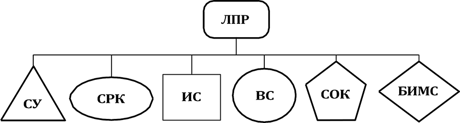 ЛПР – лицо, принимающее решения (первый руководитель); СУ – система управления; СРК – система реализации коммуникатирования; ИС – исполнительная система; ВС – вспомогательная система; СОК – система обеспечения качества; БИМС – блок интегрального мониторинга системы