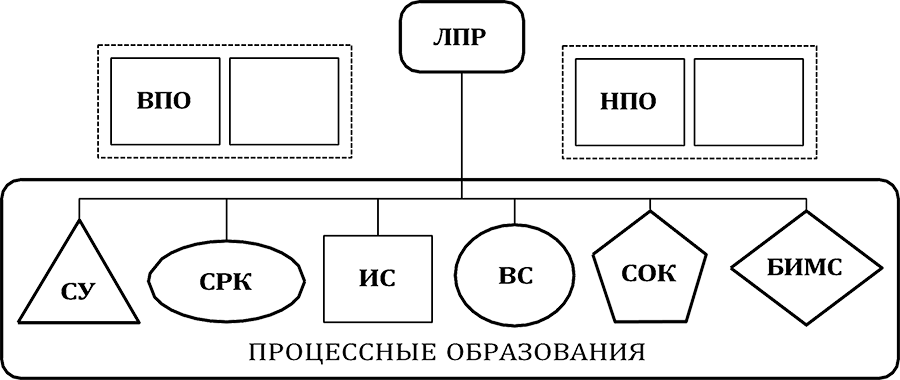 ЛПР – лицо, принимающее решение (первый руководитель); ВПО – внепроцессные образования; НПО – надпроцессные образования; СУ – система управления; СРК – система реализации коммуникатирования; ИС – исполнительная система; ВС – вспо- могательная система; СОК – система обеспечения качества; БИМС – блок интеграль- ного мониторинга системы