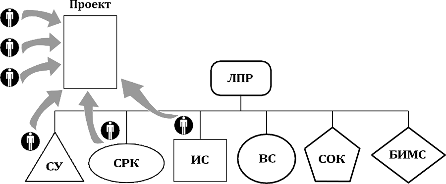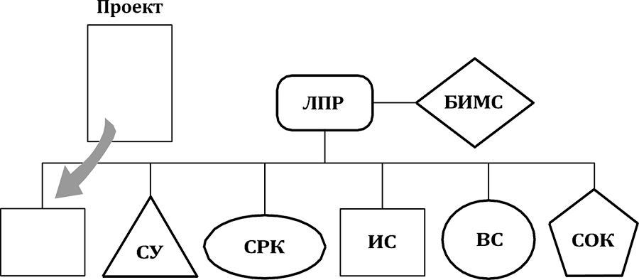 ЛПР – лицо, принимающее решение (первый руководитель); СУ – система управления; СРК – система реализации коммуникатирования; ИС – исполнительная система; ВС – вспомогательная система; СОК – система обеспечения качества; БИМС – блок интегрального мониторинга системы