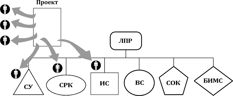 Проекты возникают, когда необходимо решить вновь возникшую задачу, решение которой не является типичным для существующих элементов процессных образований (рис. 1.28). Например, создание филиальной сети у торговой компании, в которой раньше филиалов не было. Просто расширение сети как количественное увеличение состава процессных образований не будет внепроцессным образованием. Иногда проекты могут создаваться для нетипичных разовых задач. Создание проектов происходит формированием специализированной группы исполнителей во главе с руководителем проекта, нацеленной только на выполнение задачи проекта (см. рис. 1.28). Это обусловлено необходимостью сконцентрировать решение этой задачи в одних руках. Например, обосновать приобретение или отказ от приобретения непрофильного актива.