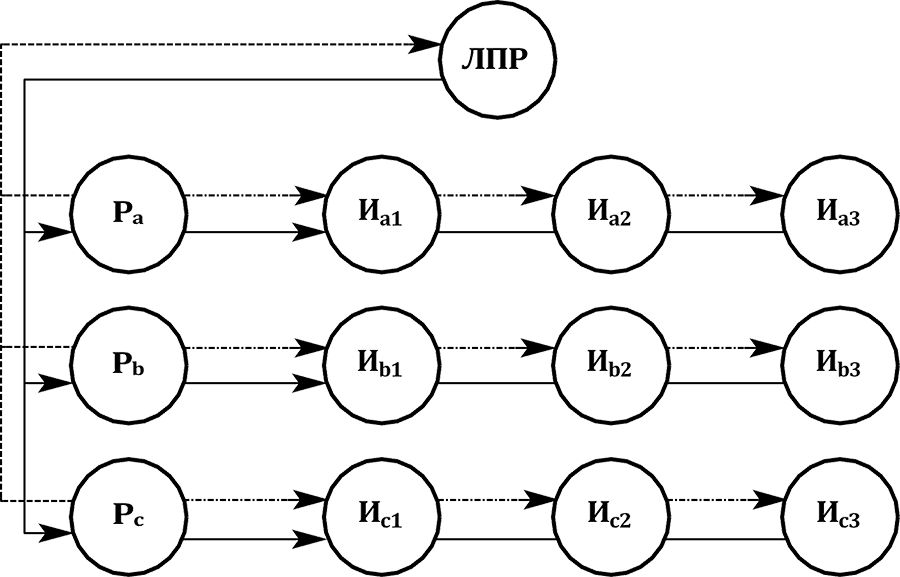 ЛПР – лицо, принимающее решение (первый руководитель); Р – руководитель про- екта (a, b, c); И – исполнитель;