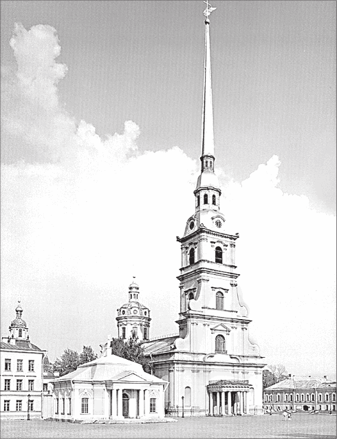 Церковь в крепости начали строить сразу с возведением стен фортификационного сооружения, и уже 1 апреля 1704 г. небольшой деревянный храм был освящён. Его выделяли три высоких шпиля, расписанных под мрамор и непривычных для русской церковной архитектуры. В 1712 г. начинается работа по возведению в крепости каменного храма по проекту архитектора Д. Трезини. Огромный для своего времени (общая его высота составляла 122,5 м, высота шпиля – около 55 м), Петропавловский собор строился долго и был освящён только в 1733 г.