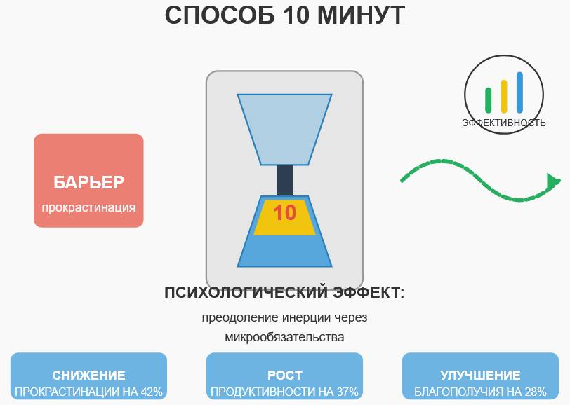 Секрет эффективности «Способа 10 минут» кроется в особенностях человеческой психологии. Наш мозг запрограммирован избегать сложных, энергозатратных задач, даже если в долгосрочной перспективе они принесут положительный результат. Психологи называют это явление «отсрочкой удовлетворения». Однако преодолеть первичное сопротивление становится значительно проще, когда мы снижаем психологический барьер входа.