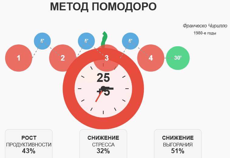 Первоначально Чирилло экспериментировал с разными временными интервалами. Начав с 10 минут, он методом проб и ошибок пришел к выводу, что 25 минут – оптимальное время для глубокой концентрации без истощения когнитивных ресурсов. Это неслучайное число -