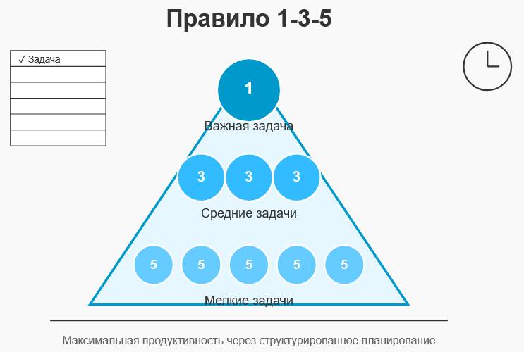 Правило 1-3-5 удивительно просто и именно в этой простоте кроется его сила. Каждый рабочий день вы планируете выполнить: