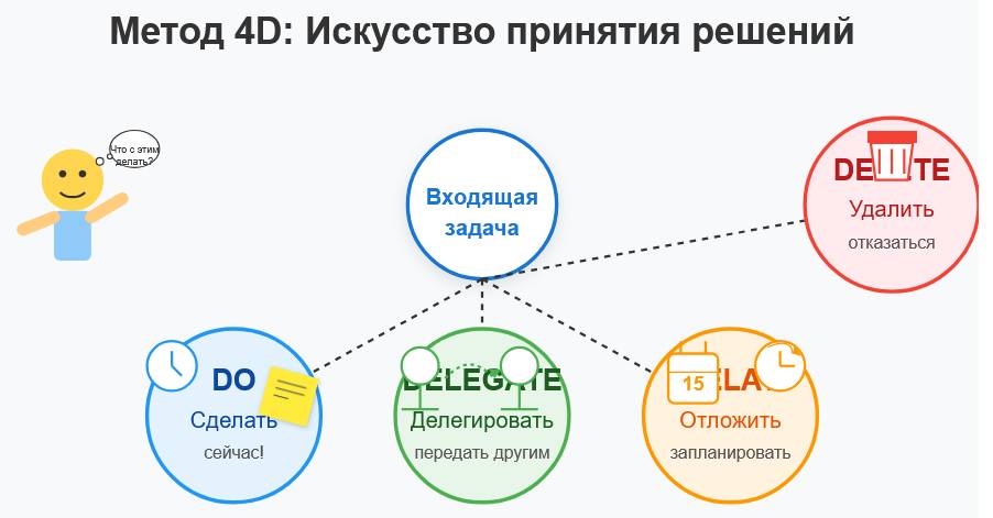 Истинная красота метода 4D заключается в его простоте и универсальности. Четыре решения, принимаемые быстро и осознанно, могут трансформировать хаос в порядок, стресс – в спокойствие, а перегруженность – в продуктивность.