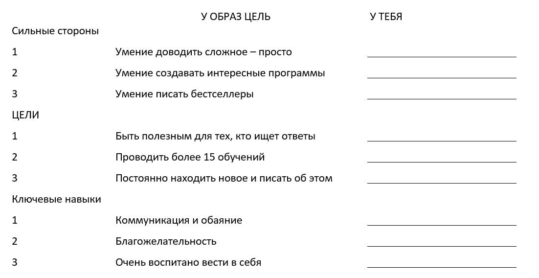 Но ты можешь стать таким как он: и в течение 1 минуты напиши список 5 комплиментов для себя, о том, что для тебя является близким с Твоим образом – целью.