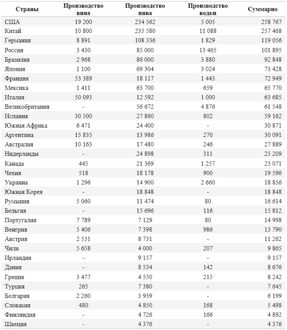 Основная доля этилового спирта в пищевой промышленности приходится на «алкогольные напитки». Вот некоторые данные по производству алкоголя в разных странах на 2004 г. (тыс. гекталитров7):