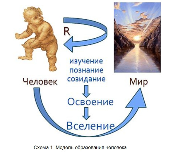 Человек изучает и познаёт окружающий мир, созидая образовательные продукты. В результате он осваивает внешний мир, вселяется в него. На основе рефлексии (R) происходит фиксация внешних и внутренних новообразований. Человек образуется внутренне; мир пополняется продуктами его деятельности.