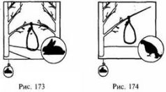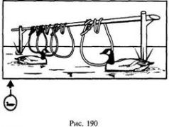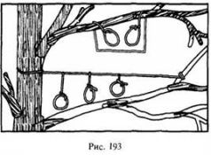 На ветках деревьев, используемых птицами в качестве насеста (которые нетрудно определить по обилию помета на нижерасположенных ветках и земле), можно установить несколько петель, с таким расчетом, чтобы они оказались на уровне голов сидящих птиц (рис. 193).