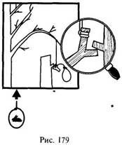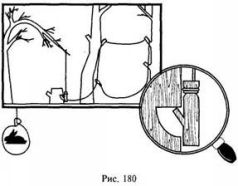 В более простом варианте сторожок – вилкообразная ветка – зацепляется просто за выступающий из ствола дерева обрубленный сучок. К недостаткам такого пружка относится сверхчувствительность и сложность зацепа сторожка за сучок (рис. 180).